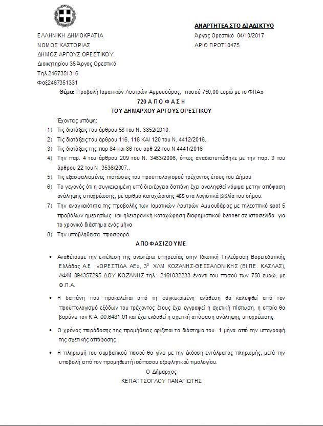 Όπως εν προκειμένω από τον Δήμο του Άργους Ορεστικού, ο οποίος μερίμνησε να αναθέσει την διαφημιστική προβολή των ιαματικών πηγών Αμουδάρας στον τηλεοπτικό σταθμό Flash που ανήκει στην οικογένειά του (στη σύζυγο) του Περιφερειάρχη, μόλις δύο μέρες πριν την λήξη της σαιζόν.