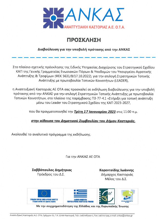 Στα πλαίσια της διαβούλευσης για το ΝΕΟ LEADER 2023-2027, για την επιλογή στρατηγικών τοπικής ανάπτυξης με πρωτοβουλία τοπικών κοινοτήτων, σας διαβιβάζω την Πρόσκληση και το Πρόγραμμα της Εκδήλωσης, που θα πραγματοποιηθεί την Τρίτη 17 Ιανουαρίου 2023 στις 11:00 στην αίθουσα του Δημοτικού Συμβουλίου του Δήμου Καστοριάς.