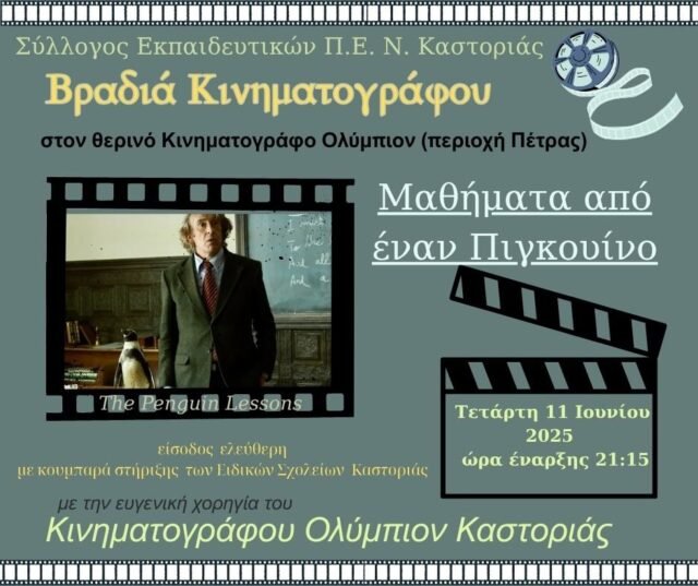 Ο Σύλλογος Εκπαιδευτικών Πρωτοβάθμιας Εκπαίδευσης Ν. Καστοριάς παρέδωσε το χρηματικό ποσό των 270 ευρώ, που συγκεντρώθηκε στο πλαίσιο της φιλανθρωπικής εκδήλωσης – προβολής ταινίας με τίτλο: «Μαθήματα από έναν Πιγκουίνο», που πραγματοποιήθηκε την Τετάρτη 11 Ιουνίου 2025 στον θερινό Κινηματογράφο Ολύμπιον Καστοριάς, στα Ειδικά Σχολεία Πρωτοβάθμιας και Δευτεροβάθμιας Εκπαίδευσης Καστοριάς.