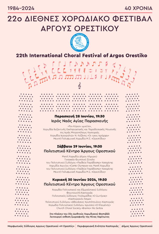 Με αναβαθμισμένες τριήμερες εκδηλώσεις και τιμώμενη Χορωδία την Church Choral Society “Branko” Nis Serbia, με έτος ίδρυσης το1887, λαμβάνει χώρα το τριήμερο 28-30 Ιουνίου 2024, το 22ο ΔΙΕΘΝΕΣ ΧΟΡΩΔΙΑΚΟ ΦΕΣΤΙΒΑΛ ΑΡΓΟΥΣ ΟΡΕΣΤΙΚΟΥ, ο κορυφαίος και καταξιωμένος Χορωδιακός θεσμός, μία γιορτή του Χορωδιακού τραγουδιού, που έχει προσφέρει μεγάλες συγκινήσεις στα 40 χρόνια διεξαγωγής του, με εμφανίσεις παγκοσμίου φήμης Χορωδιών.