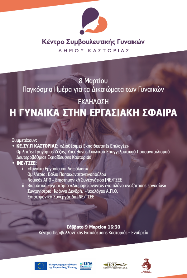 Με αφορμή την 8η Μαρτίου, «Παγκόσμια Ημέρα για τα δικαιώματα των Γυναικών», το Κέντρο Συμβουλευτικής Γυναικών του Δήμου Καστοριάς θα πραγματοποιήσει δράση ευαισθητοποίησης και ενημέρωσης με τίτλο «Η Γυναίκα στην Εργασιακή Σφαίρα», το Σάββατο 9 Μαρτίου, στις 16:30, στο Κέντρο περιβαλλοντικής Εκπαίδευσης Καστοριάς – Ενυδρείο.