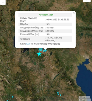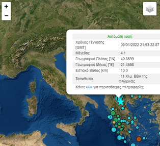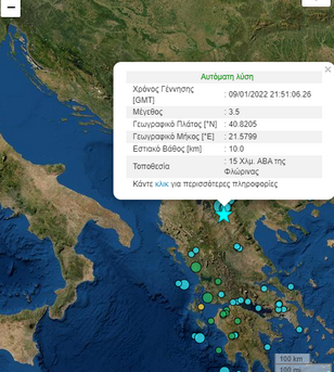ΕλλάδαΚοινωνία Άλλοι δύο σεισμοί γύρω από την Φλώρινα και ένας στην Καστοριά 10 Ιανουαρίου 2022 FacebookTwitterPinterestWhatsApp Άλλες δύο σεισμικές δονήσεις μεγέθους 3,5 3,5 και 4,1 αντίστοιχα σημειώθηκαν σε περιοχές γύρω από την Φλώρινα. Ενώ μία ακόμα 2,9 σημειώθηκε ΔΝΔ της Καστοριά κοντά στο Άργος Ορεστικό Κοινοποιήστε: Mοιραστείτε στο Facebook(Ανοίγει σε νέο παράθυρο) Facebook Share on X(Ανοίγει σε νέο παράθυρο) X