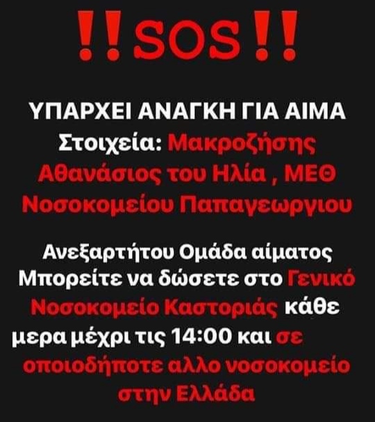Έκκληση για άμεση ανάγκη αίματος στον όνομα Μακροζήσης Αθανάσιος του Ηλία που νοσηλεύεται στην ΜΕΘ του Νοσοκομείου Παπαγεωργίου στη Θεσσαλονίκη.