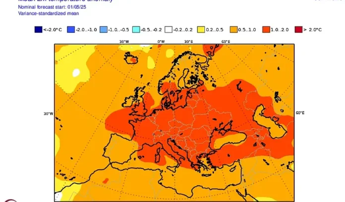 Τα στοιχεία από την ευρωπαϊκή υπηρεσία Copernicus (C3S) και το ECMWF συγκλίνουν: Η Ευρώπη αναμένεται να βιώσει καλοκαίρι με θετικές αποκλίσεις θερμοκρασίας σε όλη την ήπειρο. Οι μέσες θερμοκρασίες ενδέχεται να είναι τουλάχιστον 0,5°C πάνω από τα κανονικά επίπεδα και τοπικά έως και 1-2°C υψηλότερες.