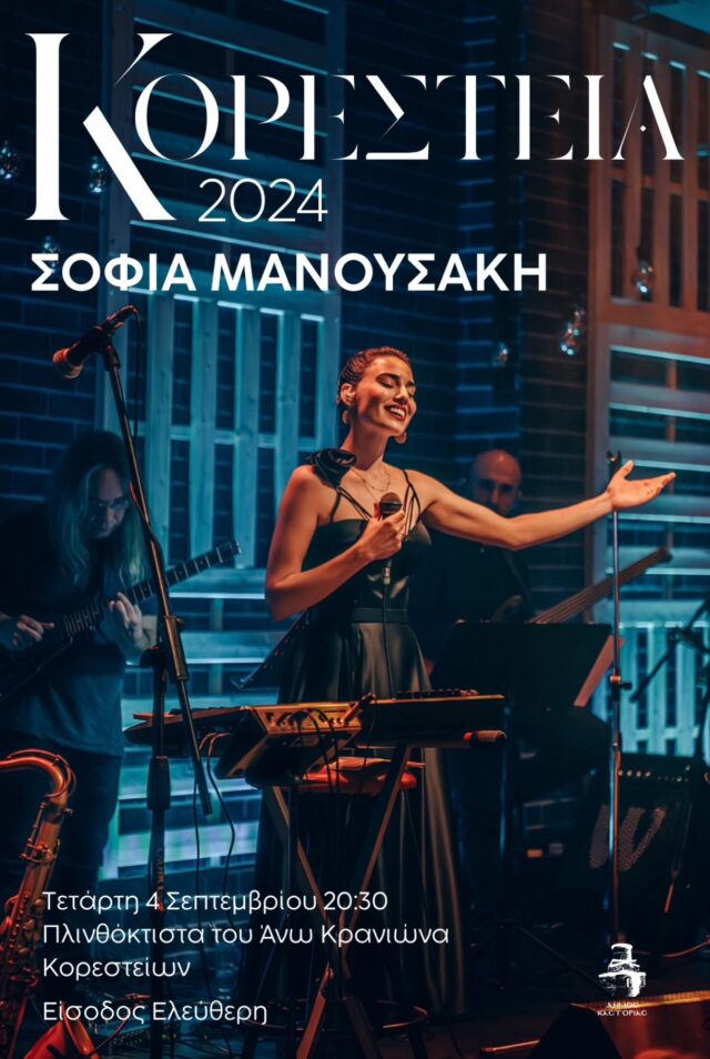 Λόγω των δυσμενών των καιρικών συνθηκών που προβλέπονται για την Παρασκευή 30 Αυγούστου, η συναυλία της Σοφίας Μανουσάκη στα Πλινθόκτιστα του Άνω Κρανιώνα Κορεστείων αναβάλλεται και θα πραγματοποιηθεί την Τετάρτη 4 Σεπτεμβρίου και ώρα 20:30.