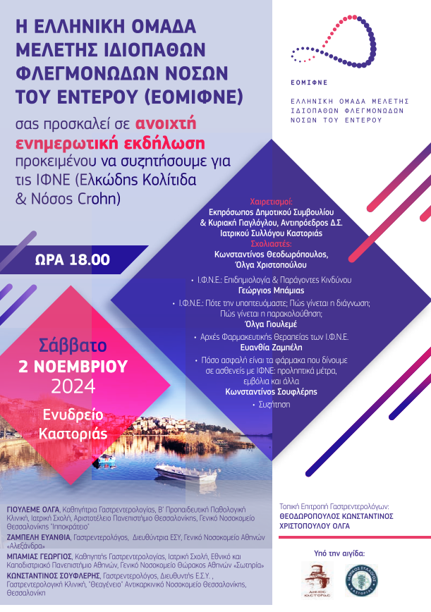 Με αυτήν την προοπτική, ο επόμενος σταθμός ενημέρωσης διοργανώνεται στην πόλη της Καστοριάς το Σάββατο 2 Νοεμβρίου, ώρα 18.00 στο «ΕΝΥΔΡΕΙΟ» της Καστοριάς, όπου ασθενείς και γιατροί θα συναντηθούν και θα ανταλλάξουν απόψεις. Το πρόγραμμα της εκδήλωσης περιλαμβάνει εισηγήσεις από μέλη της ΕΟΜΙΦΝΕ, ενώ θα ακολουθήσει συζήτηση με ερωτήσεις ασθενών και απαντήσεις γιατρών με εξειδίκευση στις ΙΦΝΕ. Την εκδήλωση θα σχολιάσουν οι Γαστρεντερολόγοι της πόλης που απαρτίζουν και την Τοπική Οργανωτική Επιτροπή και τους οποίους ευχαριστούμε για τη συμμετοχή και τη συνδρομή τους στην υλοποίηση της εκδήλωσης.