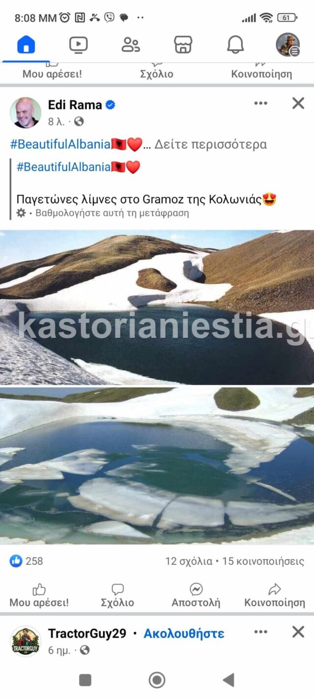 Με ανάρτησή του στο facebook ο αλβανός πρωθυπουργός Έντι Ράμμα καταχωρεί ως «αλβανικό έδαφος» την αλπική λίμνη «Γκιστόβα» του Γράμμου και την προβάλει για τουριστικούς λόγους ως αξιοθέατο της χώρας του(!) με μεγάλη επισκεψιμότητα!