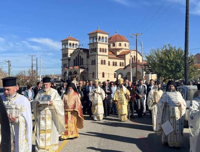 Κατὰ τὴν διάρκεια τοῦ Ὄρθρου, ὁ Ἡγούμενος τῆς Ἱερᾶς Μονῆς τοῦ Ἁγίου Διονυσίου του ἐν Ὀλύμπῳ, Ἄρχιμ. π. Μάξιμος Κυρίτσης, προσεκόμισε στὸν ἑορτάζοντα Ἱερὸ Ναό, ἱερὸ Λείψανο τοῦ Ἁγίου Διονυσίου.