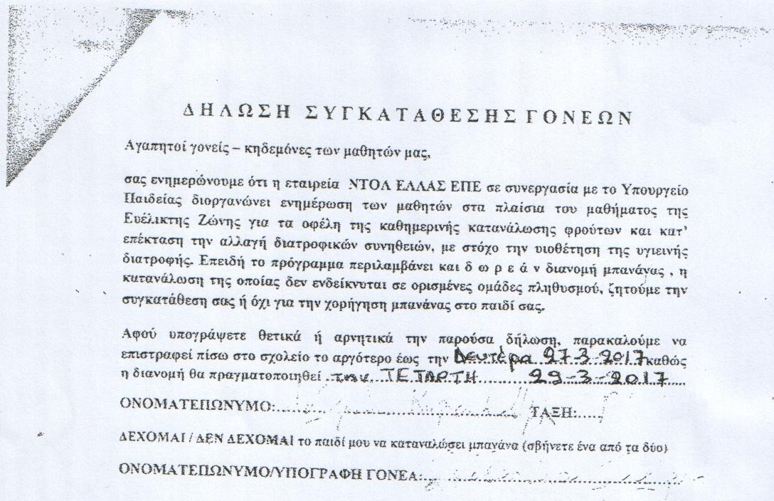 Με μεγάλη έκπληξη αντίκρισα σήμερα ένα έντυπο δήλωσης συγκατάθεσης γονέων το οποίο παραθέτω και αφορά την ενημέρωση των μαθητών για την κατανάλωση ‘’φρούτων’’, δηλαδή μπανάνας. Καλά, το υπουργείο παιδείας αγρόν αγοράζει, το υπουργείο αγροτικής ανάπτυξης; Η διεύθυνση πρωτοβάθμιας εκπαίδευσης; Οι σχολικοί σύμβουλοι; Οι διευθυντές των σχολείων; Η ένωση γονέων και κηδεμόνων; Οι σύλλογοι γονέων και κηδεμόνων;