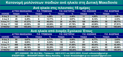 Στην Περιφερειακή Ενότητα Κοζάνης από τις 13 Σεπτεμβρίου μολύνθηκαν 502 παιδιά, εκ των οποίων τα 34 είναι ηλικίας έως 3 ετών, τα 31 ηλικίας 4-5 ετών, τα 203 ηλικίας 6 έως 11 ετών και τα 234 ηλικίας από 12 έως και 17 ετών.