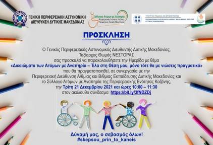 Η Γενική Περιφερειακή Αστυνομική Διεύθυνση Δυτικής Μακεδονίας, στο πλαίσιο δράσεων και εκδηλώσεων – πρωτοβουλιών του Αρχηγείου της Ελληνικής Αστυνομίας, διοργανώνει την Τρίτη 21 Δεκεμβρίου 2021 και ώρες 10:00 – 11:30, διαδικτυακή ημερίδα με θέμα: «Δικαιώματα των Ατόμων με Αναπηρία – Έλα στη Θέση μου, μόνο τότε θα με νιώσεις πραγματικά», σε συνεργασία με την Περιφερειακή Διεύθυνση Α/θμιας και Β/θμιας Εκπαίδευσης Δυτικής Μακεδονίας και το Σύλλογο Ατόμων με Αναπηρία της Περιφερειακής Ενότητας Κοζάνης, που θα έχετε τη δυνατότητα να παρακολουθήσετε μέσω της διαδικτυακής πλατφόρμας you Tube στον ακόλουθο σύνδεσμο https://bit.ly/3fNDZDj