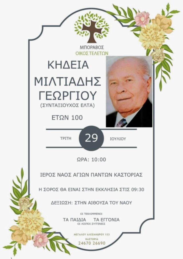Έφυγε από την ζωή πλήρης ημερών σε ηλικία 100 ετών ο συνταξιούχος ταχυδρόμος της Καστοριάς, Μιλτιάδης Γεωργίου με καταγωγή από την Λάγκα.