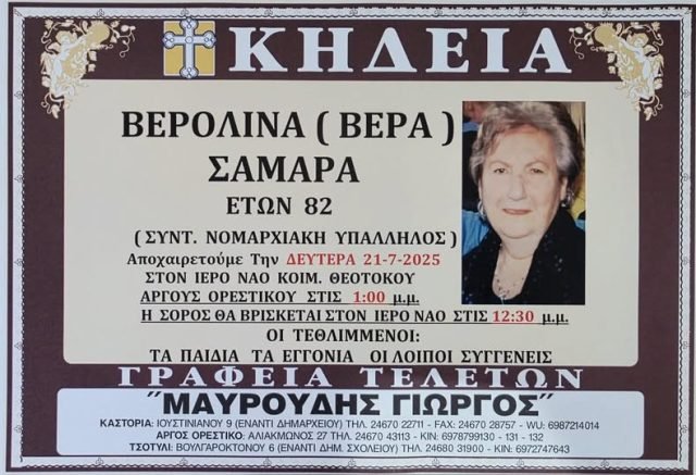 ΕλλάδαΚοινωνία Εφυγε απο την ζωή πρώην νομαρχιακή υπάλληλος 21 Ιουλίου 2025 FacebookTwitterPinterestWhatsApp Έφυγε από την ζωή σε ηλικία 82 ετών η πρώην νομαρχιακή υπάλληλος Βέρα Σαμαρά. Η κηδεία της θα γίνει αύριο Δευτέρα 21-7-2025 στη 1 το μεσημέρι από τον Ιερό Ναό Κοιμήσεως της Θεοτόκου Άργους Ορεστικού Καλό Παράδεισο!!! Κοινοποιήστε: Mοιραστείτε στο Facebook(Ανοίγει σε νέο παράθυρο) Facebook Share on X(Ανοίγει σε νέο παράθυρο) X