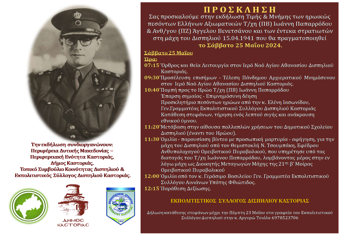 ΚαστοριάΕκδηλώσεις Εκδηλώσεις “Παπαρρόδεια 2024” στο Δισπηλιό (πρόσκληση -πρόγραμμα) 21 Μαΐου 2024 FacebookTwitterPinterestWhatsApp Εκδήλωση Τιμής και Μνήμης των ηρωικός πεσόντων Ελλήνων Αξιωματικών Τ/χη (ΠΒ) Ιωάννη Παπαρρόδου και Ανθ/γου (ΠΖ) Άγγελου Βεενετσάνου και των έντεκα στρατιωτικών στη μάχη του Δισπηλιού 15.04.1941 που θα πραγματοποιηθεί το Σάββατο 25 Μαΐου 2024 Κοινοποιήστε: Mοιραστείτε στο Facebook(Ανοίγει σε νέο παράθυρο) Facebook Share on X(Ανοίγει σε νέο παράθυρο) X