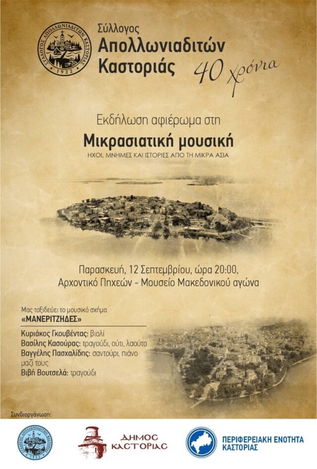Την Παρασκευή 12 Σεπτεμβρίου, στις 20:00 στο Αρχοντικό Πηχεών μεγάλη μουσική εκδήλωση-αφιέρωμα στη Μικρασιάτικη μουσική, με το μουσικό σχήμα «ΜΑΝΕΡΙΤΖΗΔΕΣ».