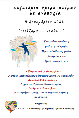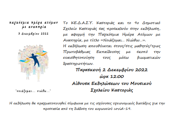 Το ΚΕ.Δ.Α.Σ.Υ. Καστοριάς και το 9ο Δημοτικό Σχολείο Καστοριάς, με αφορμή την Παγκόσμια ημέρα Ατόμων με Αναπηρία, διοργανώνουν εκδηλώσεις, με σκοπό την ευαισθητοποίηση των μαθητών/τριών μέσω βιωματικών δραστηριοτήτων.
