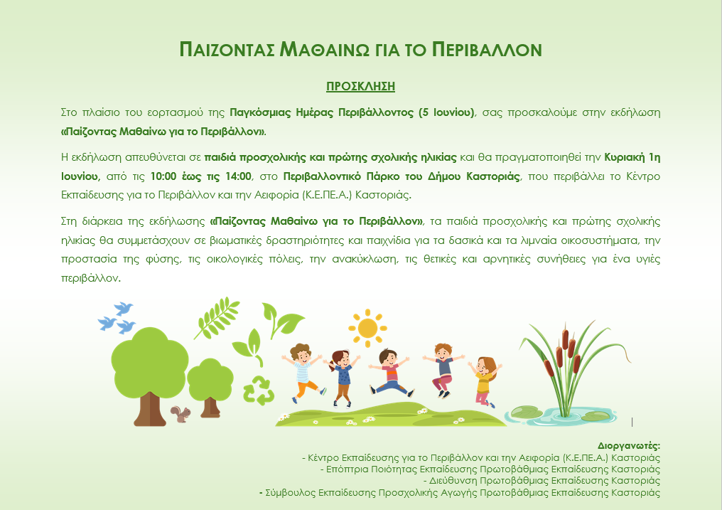 Στο πλαίσιο του εορτασμού της Παγκόσμιας Ημέρας Περιβάλλοντος (5 Ιουνίου), το Κέντρο Εκπαίδευσης για το Περιβάλλον και την Αειφορία (Κ.Ε.ΠΕ.Α.) Καστοριάς και η Επόπτρια Ποιότητας Εκπαίδευσης Πρωτοβάθμιας Εκπαίδευσης Καστοριάς, σε συνεργασία με τη Διεύθυνση Πρωτοβάθμιας Εκπαίδευσης Καστοριάς και τη Σύμβουλο Εκπαίδευσης Προσχολικής Αγωγής Πρωτοβάθμιας Εκπαίδευσης Καστοριάς, διοργανώνουν την εκδήλωση «Παίζοντας Μαθαίνω για το Περιβάλλον» για παιδιά προσχολικής και πρώτης σχολικής ηλικίας.