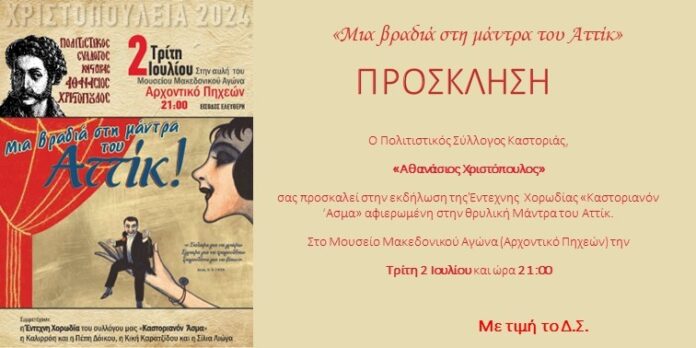 ΚαστοριάΕκδηλώσεις Εκδήλωση αφιερωμένη στην θρυλική Μάντρα του Αττίκ από τον Πολιτιστικό Σύλλογο “Αθανάσιος Χριστόπουλος 1 Ιουλίου 2024 FacebookTwitterPinterestWhatsApp Εκδήλωσηφιερωμένη στην θρυλική Μάντρα του Αττίκ με την Έντεχνη Χορωδία “Καστοριανόν Άσμα” από τον Πολιτιστικό Σύλλογο “Αθανάσιος Χριστόπουλος Κοινοποιήστε: Mοιραστείτε στο Facebook(Ανοίγει σε νέο παράθυρο) Facebook Share on X(Ανοίγει σε νέο παράθυρο) X