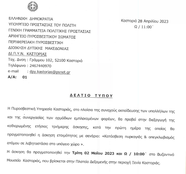 Εκπαιδευτική άσκηση θα πραγματοποιήσεις η Πυροσβεστική Υπηρεσία Καστοριάς. αύριο Τρίτη