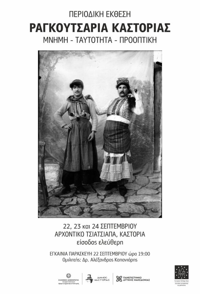 Στο πλαίσιο των εορτασμών για τις Ευρωπαϊκές Ημέρες Πολιτιστικής Κληρονομιάς 2023 με το κοινό πανευρωπαϊκό θέμα «Πολιτιστική Κληρονομιά και Παράδοση: Μαρτυρίες του χθες στο σήμερα» (European Heritage Days 2023: Living Heritage), ο Δήμος Καστοριάς, η Εφορεία Αρχαιοτήτων Καστοριάς, και το Τμήμα Επικοινωνίας και Ψηφιακών Μέσων του Πανεπιστημίου Δυτικής Μακεδονίας σας προσκαλούν στα εγκαίνια της έκθεσης «Μνήμη – Ταυτότητα – Προοπτική, Καρναβάλι Καστοριάς (Ραγκουτσάρια)» στο Αρχοντικό Τσιατσιαπά, την Παρασκευή 22 Σεπτεμβρίου 2023 και ώρα 19:00 μ.μ.
