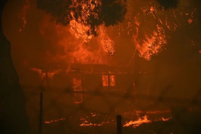 Νωρίτερα το μέτωπο της φωτιάς «έσπασε» στα τρία, με την φωτιά να κινείται ανεξελέγκτα μεταξύ σπιτιών.