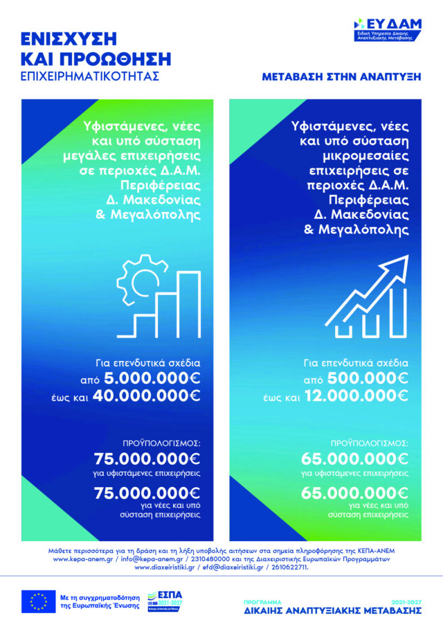Με βασικά μηνύματα «Νέες δυνατότητες για τις μεγάλες επιχειρήσεις!» και «Νέο παραγωγικό μοντέλο, νέες λύσεις για τις μικρομεσαίες επιχειρήσεις!» η ενημερωτική προβολή σε τηλεόραση, ραδιόφωνο, έντυπα, καθώς και μέσα κοινωνικής δικτύωσης, προσκαλεί όλους όσους αναζητούν χρηματοδότηση για να ξεκινήσουν ή να ενισχύσουν την επιχείρησή τους, να βρουν τη δράση που ανταποκρίνεται στις ανάγκες τους, στο πλαίσιο του Προγράμματος «Δίκαιη Αναπτυξιακή Μετάβαση» 2021-2027. Οι μεν δράσεις για τις μεγάλες επιχειρήσεις αφορούν επενδυτικά σχέδια από 5.000.000€ έως και 40.000.000€, ενώ οι αντίστοιχες δράσεις για τις μικρομεσαίες επιχειρήσεις αφορούν επενδυτικά σχέδια από 500.000€ έως και 12.000.000€.