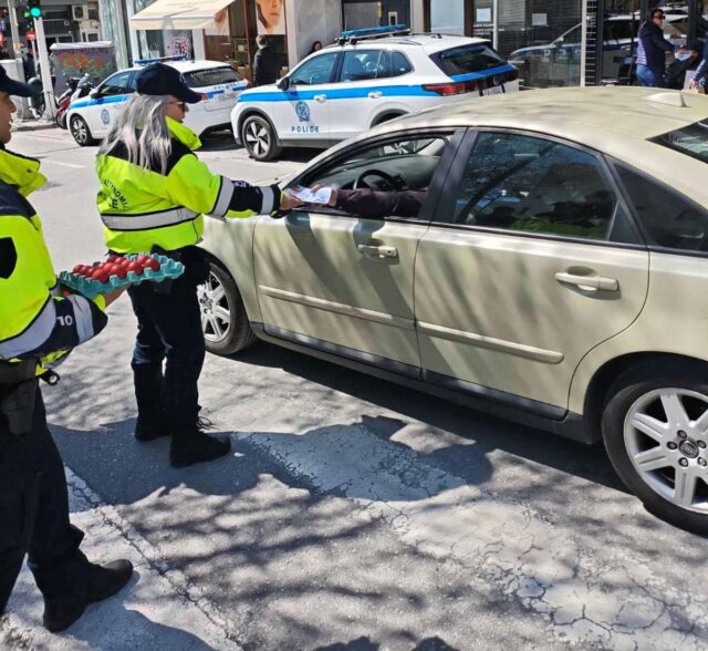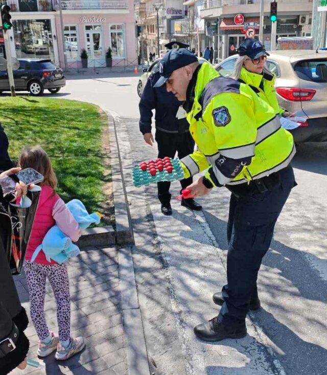 Συμβολική ήταν η κίνηση των Αστυνομικών του Τμήματος Τροχαίας Κοζάνης και Εορδαίας να προσφέρουν σε διερχόμενους πεζούς και οδηγούς οχημάτων γλυκίσματα και κόκκινα αυγά, ευχόμενοι Καλή Ανάσταση και Καλό Πάσχα, στέλνοντας και φέτος το μήνυμα «το Πάσχα τσουγκρίζουμε στο σπίτι και όχι στο δρόμο».
