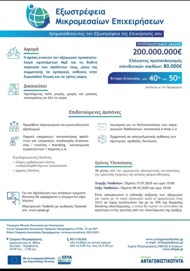 Ξεκινά σήμερα 17/07/2025 και ολοκληρώνεται στις 09/10/2025 η υποβολή προτάσεων στη δράση “Εξωστρέφεια Μικρομεσαίων Επιχειρήσεων” με
