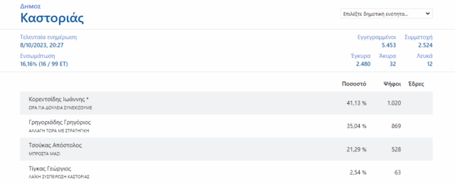 Επίσημα αποτελέσματα στο 16,16% του Δήμου Καστοριάς