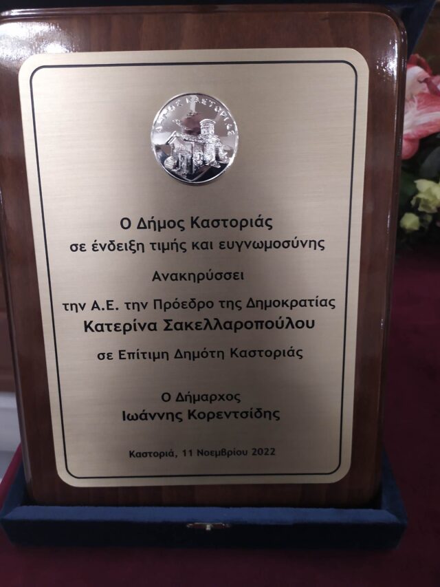 Με ομόφωνη απόφαση του Δημοτικού Συμβουλίου του Δήμου Καστοριάς, ανακηρύχθηκε επίτιμη δημότης η Πρόεδρος της Δημοκρατίας Κατερίνα Σακελαροπούλου, η οποία σήμερα παρέστη στις επετειακές εκδηλώσεις για τα 110 χρόνια από την απελευθέρωση της πόλης.