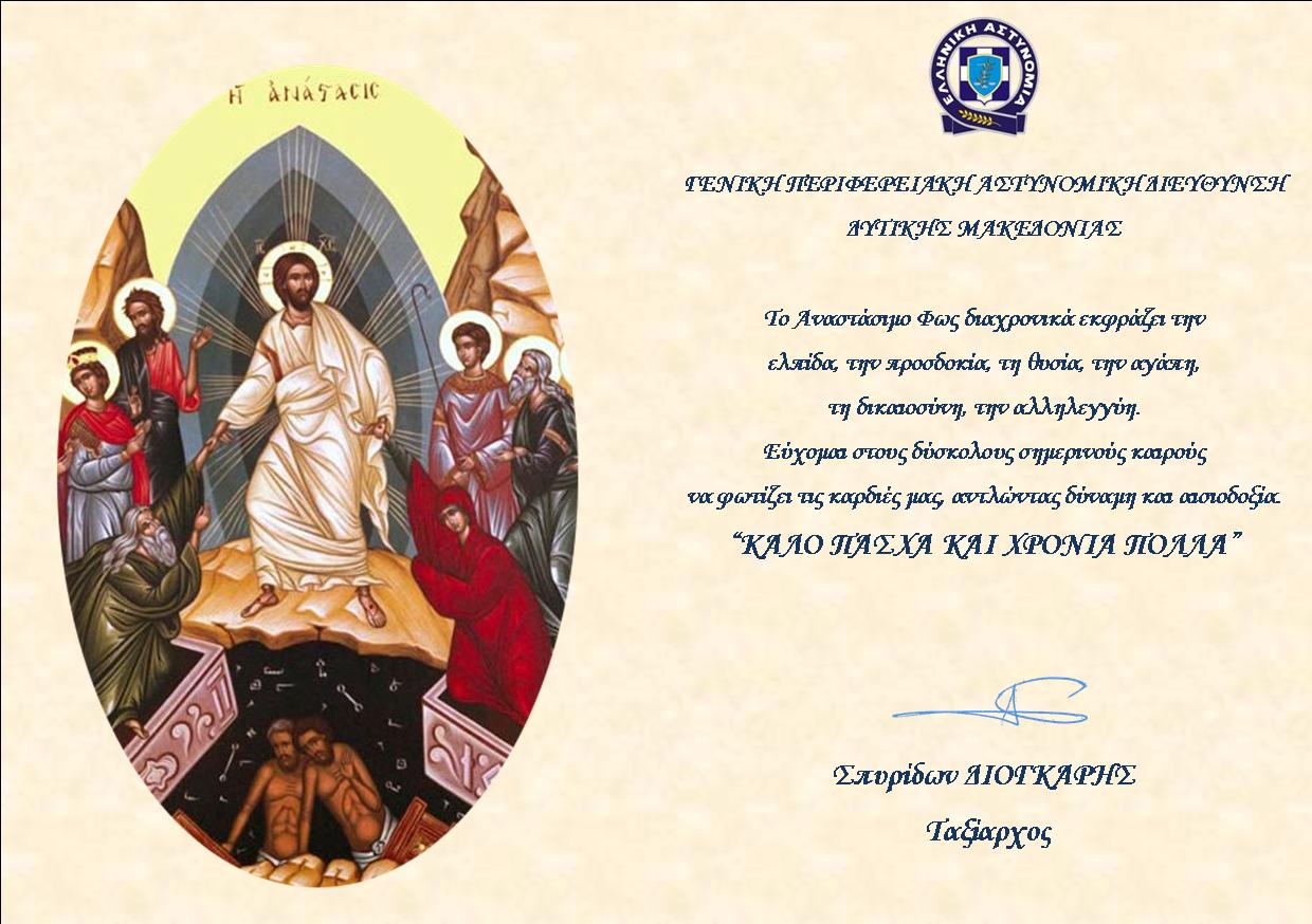 Ο Γενικός Περιφερειακός Αστυνομικός Διευθυντής Δυτικής Μακεδονίας, Ταξίαρχος Σπυρίδων Διόγκαρης, εύχεται στους πολίτες της Δυτικής Μακεδονίας και όσους θα επισκεφθούν την περιοχή για τις Άγιες ημέρες των εορτών του Πάσχα, υγεία και κάθε προσωπική και οικογενειακή ευτυχία.