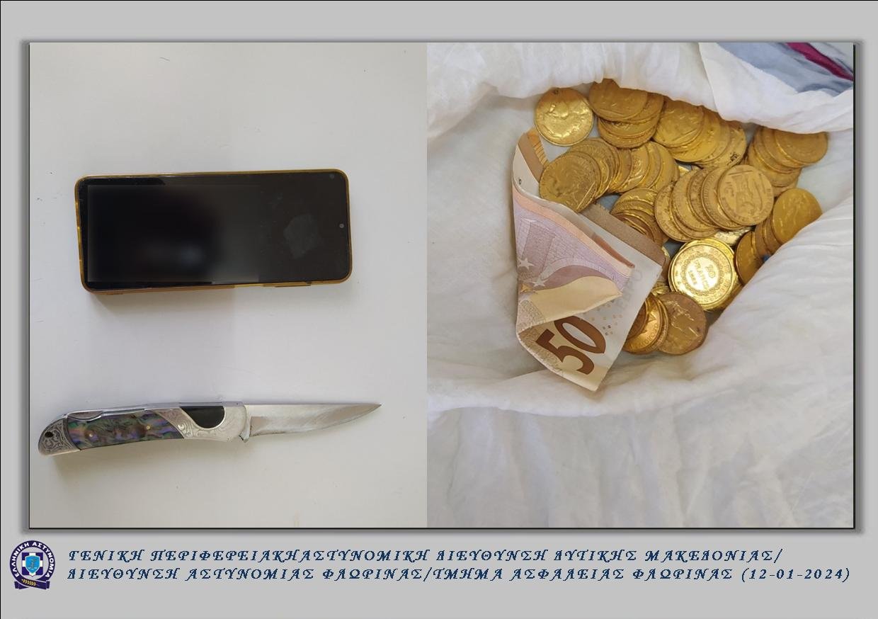 Κατόπιν τούτου, οργανώθηκε άμεσα αστυνομική επιχείρηση, στο πλαίσιο της οποίας αστυνομικοί του Τμήματος Ασφάλειας Φλώρινας, εντόπισαν στην πόλη της Φλώρινας, Ι.Χ.Ε. αυτοκίνητο με επιβαίνοντες τον 41χρονο και τον 59χρονο και συνέλαβαν αυτούς τη στιγμή που 88χρονος ημεδαπός τους κατέβαλε, έξωθεν της οικίας του, -71- χρυσές λίρες χρηματικής αξίας περίπου -30.000- ευρώ και το χρηματικό ποσό των -100- ευρώ.
