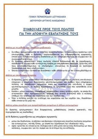 Για περισσότερες συμβουλές για την αποφυγή εξαπάτησης μπορείτε να βρείτε στην επίσημη ιστοσελίδα της Ελληνικής Αστυνομίας (www.hellenicpolice.gr) στην ενότητα Οδηγός του Πολίτη.
