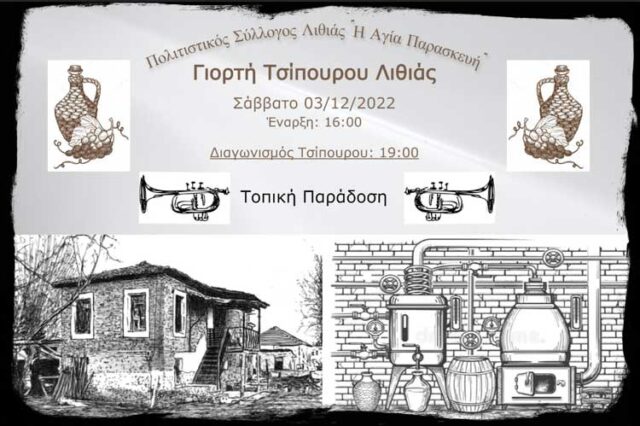 Ο Πολιτιστικός Σύλλογος Λιθιάς σας προσκαλεί στην Γιορτή Τσίπουρου Λιθιάς και στον Διαγωνισμό Τσίπουρου που θα διεξαχθεί το Σάββατο 3 Δεκεμβρίου στην περιοχή των καζανιών του χωριού. Στην γιορτή θα υπάρχει η παραδοσιακή ορχήστρα “Τοπική Παράδοση”, θα προσφέρονται τοπικά εδέσματα και ποτά, θα υπάρχουν μεγάλες εστίες φωτιάς και θα πραγματοποιηθεί λαχειοφόρος αγορά όπου όλα τα λαχεία θα κερδίζουν τοπικά προϊόντα!