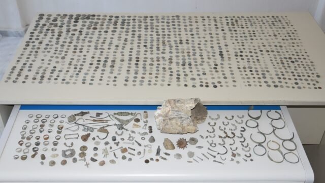 Μεταξύ άλλων βρέθηκαν και κατασχέθηκαν ένα απολίθωμα λειψάνου προβοσκιδωτού ζώου, εκτιμώμενης ηλικίας περίπου τριών εκατομμυρίων ετών, -1.096– αρχαία νομίσματα διαφόρων μεγεθών, – 49- αρχαία κοσμήματα, -123- προσαρτήματα σκευών συμποσίου
