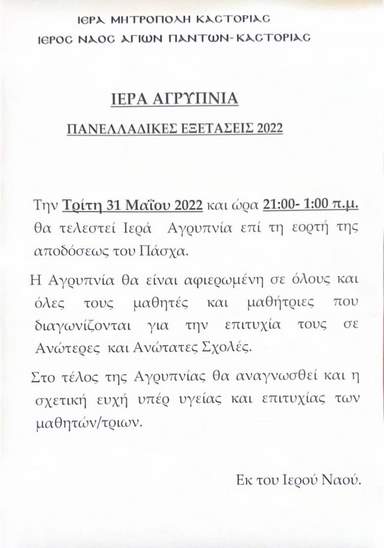 Αγρυπνία για τις πανελλαδικές στόν Ιερό Ναό Αγίων Πάντων