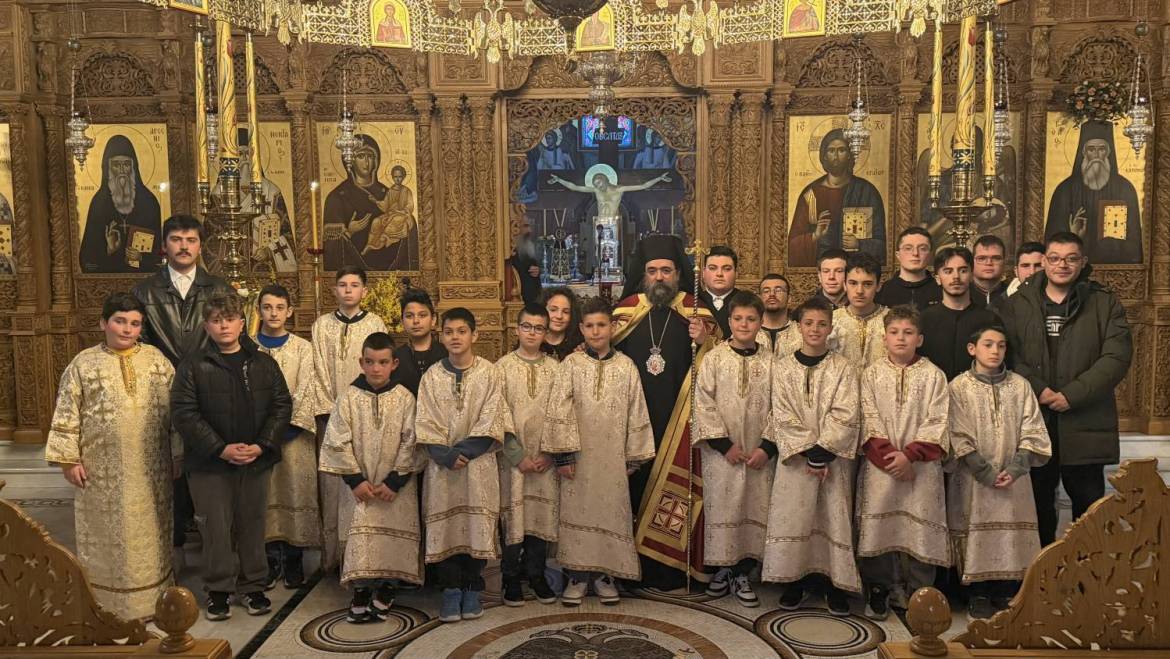 Μετά το πέρας του Εσπερινού, προσφέρθηκε κέρασμα στην αίθουσα του Ιερού Ναού, όπου πραγματοποιήθηκε σύναξη των ιεροπαίδων. Ο Σεβασμιώτατος Μητροπολίτης μίλησε με πατρική αγάπη στα παιδιά, προσφέροντάς τους ως ευλογία ένα βιβλίο με τίτλο «Δύο φύλλα δάφνης στον Παύλο Μελά» καθώς και από ένα κομποσχοίνι, τονίζοντας τη σημασία της νοεράς προσευχής στη ζωή του ανθρώπου.