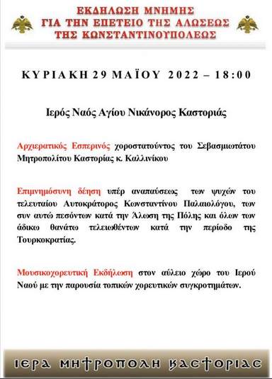 Η Ιερά Μητρόπολη Καστοριάς διοργανώνει επετειακή εκδήλωση για την αποφράδα ημέρα της Αλώσεως της Βασιλίδος των πόλεων της Κωνσταντινούπολης και τον μαρτυρικό θάνατο του τελευταίου βυζαντινού αυτοκράτορος Κωνσταντίνου Παλαιολόγου καθώς και όλων εκείνων που έπεσαν στις επάλξεις των τειχών της Πόλεως.