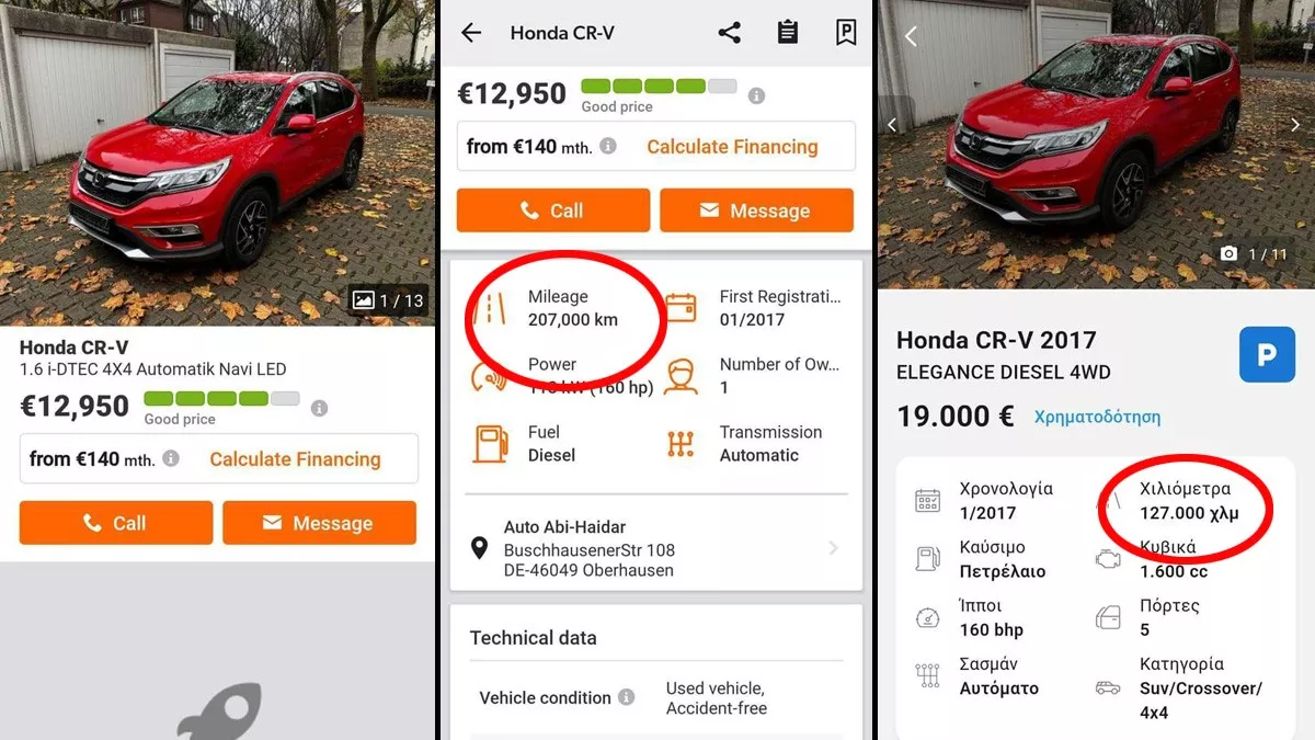 Όπως μπορείτε να δείτε από τις φωτογραφίες που μας έστειλε αναγνώστης του Newsauto, μεταχειρισμένο αυτοκίνητο 7-ετίας που πωλείται στο εξωτερικό 12.950 ευρώ με 207.000 χιλιόμετρα στην Ελλάδα ακριβώς το ίδιο είναι διαθέσιμο με 19.000 ευρώ αλλά 127.000 χιλιόμετρα.