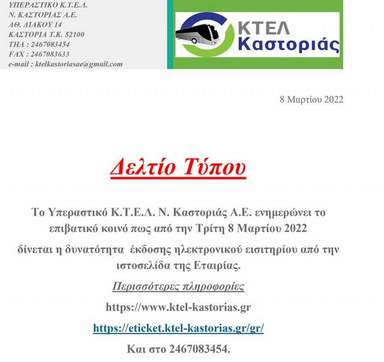 Ηλεκτρονικά εισιτήρια εκδίδει το Υπεραστικό Κ.Τ.Ε.Λ. Ν. Καστοριάς