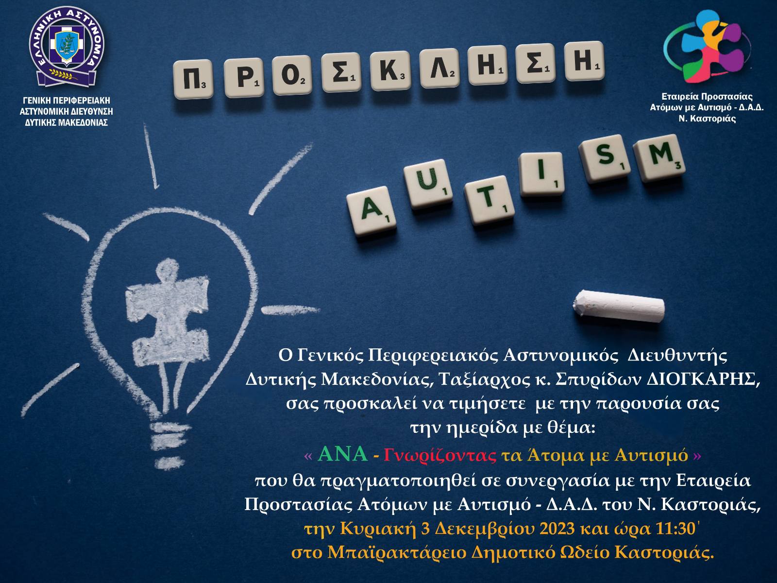Με αφορμή την Παγκόσμια Ημέρα Ατόμων με Αναπηρία (3ης Δεκεμβρίου) η Γενική Περιφερειακή Αστυνομική Διεύθυνση Δυτικής Μακεδονίας, την Κυριακή 03 Δεκεμβρίου 2023 και ώρα 11:30, στο Μπαϊρακτάρειο Δημοτικό Ωδείο Καστοριάς στη Χλόη Καστοριάς, διοργανώνει σε συνεργασία με το Κέντρο Ημέρας για Παιδιά, Εφήβους και Νεαρούς Ενήλικες στο φάσμα του Αυτισμού της Εταιρείας Προστασίας Ατόμων με Αυτισμό – Διάχυτες Αναπτυξιακές Διαταραχές της Περιφερειακής Ενότητας Καστοριάς, ημερίδα για τα δικαιώματα των Ατόμων με Αναπηρία με θέμα «Ανα-Γνωρίζοντας τα άτομα με Αυτισμό».