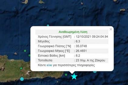 Σεισμική δόνηση 6,3 Ρίχτερ σημειώθηκε στις 12.24 με επίκεντρο 23 χιλιόμετρα ανατολικά της Ζάκρου Λασιθίου στην Κρήτη, σύμφωνα με ηλεκτρονική καταγραφή του γεωδυναμικού Ινστιτούτου στην Αθήνα.