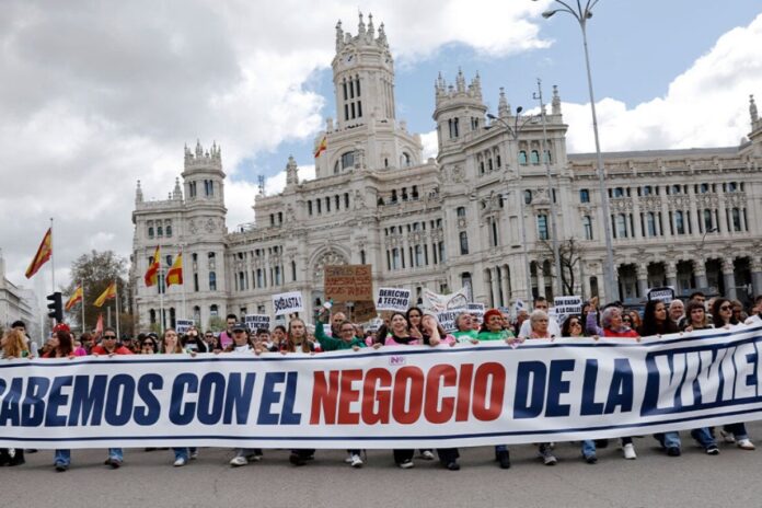 Εκατοντάδες χιλιάδες άνθρωποι διαδήλωσαν σε 40 ισπανικές πόλεις σήμερα για να διαμαρτυρηθούν για την εκτίναξη των τιμών των ενοικίων και την έλλειψη οικονομικά προσιτών κατοικιών σε μια χώρα που απολαμβάνει την ταχύτερη οικονομική ανάπτυξη στην Ευρώπη και ωστόσο υποφέρει από σοβαρή έλλειψη στέγης που επιδεινώνεται από την τουριστική έκρηξη.