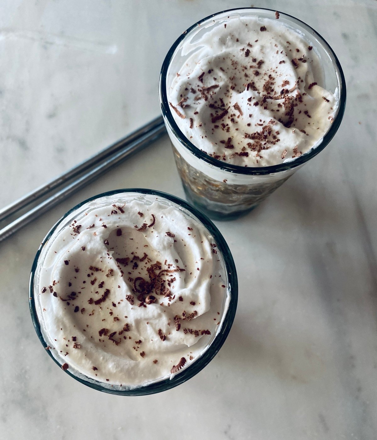Παγώνουμε τον καφέ στην κατάψυξη για να γίνει σαν γρανίτα, την οποία θρυμματίζουμε με ένα πιρούνι. Χτυπάμε κρέμα καρύδας, η οποία είναι και vegan αλλά και τόσο νόστιμη, που θα κολλήσεις γενικά. Σερβίρουμε την κρέμα πάνω από την γρανίτα και αν θέλουμε τρίβουμε πικρή σοκολάτα από πάνω. Θα το ξαναγράψω: Α-πό-λαυ-ση!