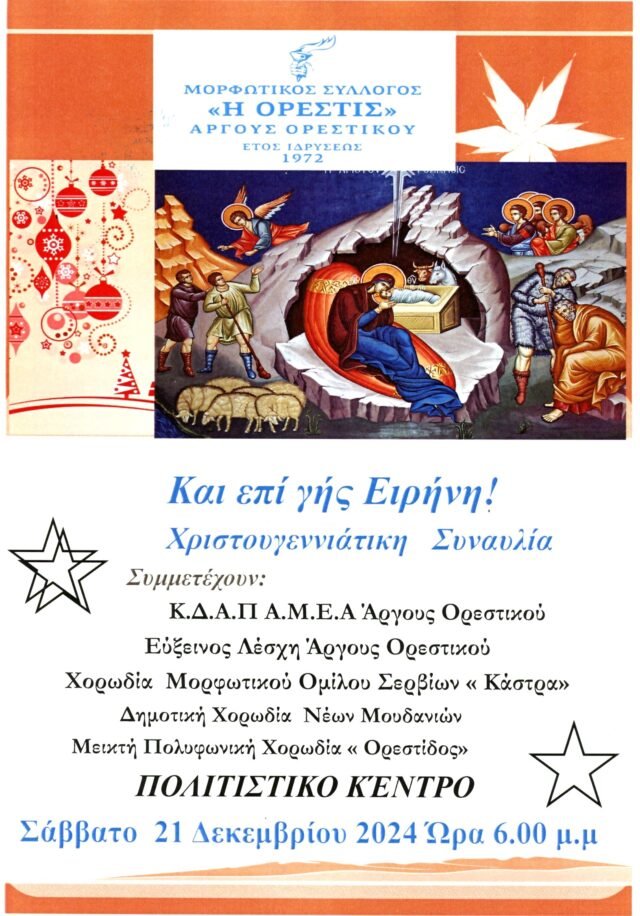 Τηρώντας έτσι μία παράδοση 50 ετών, ο Μορφωτικός Σύλλογος « Η Ορεστίς», διοργανώνει το Σάββατο 21 Δεκεμβρίου 2024 και ώρα 6.00 μ.μ, στο Πολιτιστικό Κέντρο την εκδήλωση:
