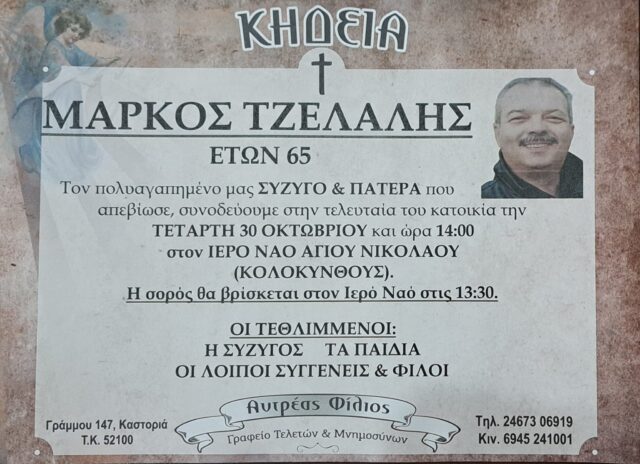 ΚαστοριάΕλλάδαΚοινωνία Kαι νέος θάνατος νέου ανθρώπου στην Καστοριά 29 Οκτωβρίου 2024 FacebookTwitterPinterestWhatsApp Έφυγε από την ζωή σε ηλικία 65 ετών ο Μάρκος Τζελαλής. Η κηδεία του θα γίνει αύριο Τετάρτη 30 Οκτωβρίου 2024 στις 14:00 από τον Ιερό Ναό Αγίου Νικολάου Κολοκυνθούς. Θερμά συλλυπητήρια στην οικογένεια Κοινοποιήστε: Mοιραστείτε στο Facebook(Ανοίγει σε νέο παράθυρο) Facebook Share on X(Ανοίγει σε νέο παράθυρο) X