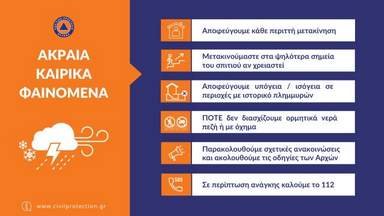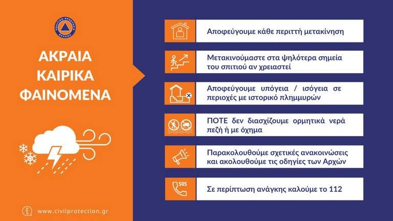 - Αποφεύγουμε κάθε περιττή μετακίνηση κατά τη διάρκεια των έντονων καιρικών φαινομένων και ασφαλίζουμε τις πόρτες και τα παράθυρά ερμητικά, έχοντας πάντα υπόψη σε περίπτωση δημιουργίας χειμάρρων να μετακινηθούμε στα ψηλότερα σημεία του σπιτιού.
