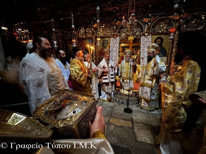 Τὸ πρωΐ τῆς ἑορτῆς, στὸ Καθολικὸ τῆς Ἱερᾶς Μονῆς, τελέσθηκε ὁ Ἀναστάσιμος Ὄρθρος καὶ ἐν συνεχείᾳ τὸ Ἀρχιερατικὸ Συλλείτουργο προεξάρχοντος τοῦ Σεβασμιωτάτου Μητροπολίτου Βρυούλων κ. Παντελεήμονος ἐκ τοῦ Οἰκουμενικοῦ μας Πατριαρχείου καὶ συλλειτουργούντων των Σεβασμιωτάτων Μητροπολιτῶν Ἰερισσοῦ κ. Θεοκλήτου καὶ Καστορίας κ. Καλλινίκου.