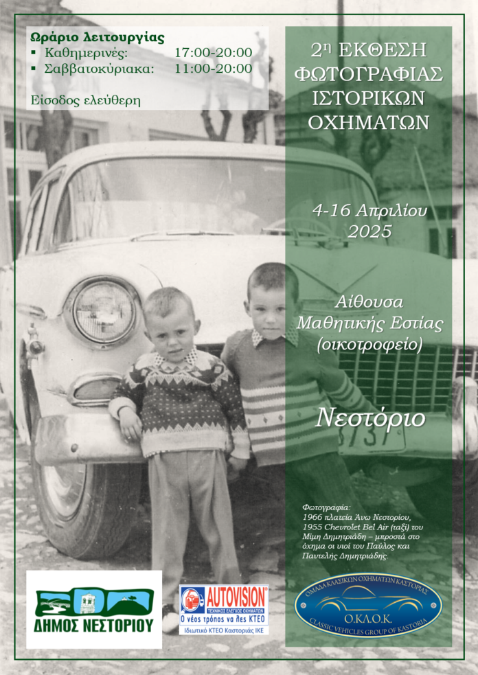 Δύο χρόνια μετά την πρώτη της Έκθεση Φωτογραφίας Ιστορικών Οχημάτων, η Ομάδα Κλασικών Οχημάτων Καστοριάς προχωρά στην επανάληψη της άκρως επιτυχημένης αυτής διοργάνωσης σε διαφορετική τοποθεσία με εμπλουτισμένο περιεχόμενο και σαφώς μεγαλύτερη χρονική διάρκεια.