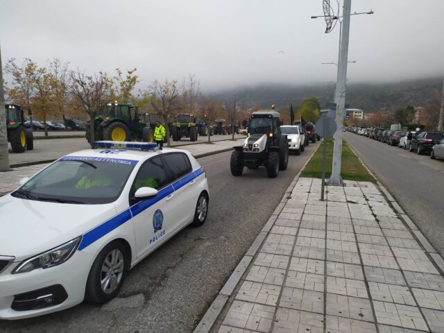 Η συγκέντρωση έκλεισε με πορεία των τρακτέρ στους κεντρικούς δρόμους της πόλης